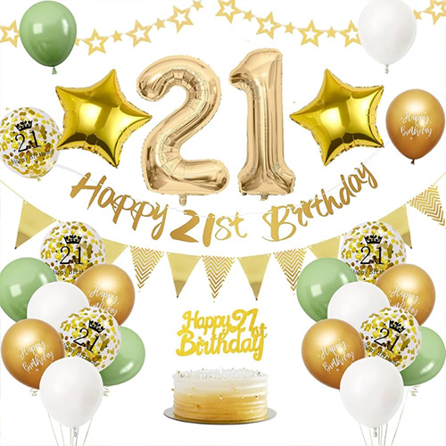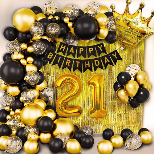 21. globo-girarda-arku multzoa: 21. globo-girarda-arku-multzo hau kolore nagusiak beltza, urrea, zilarra eta abar dira, oso egokia da gizon eta emakumezkoen apainketetarako 21. urtebetetze festan. Atean edo horman zintzilikatu daitezke, eta barruko zein kanpoko erabilerarako ere oso egokiak dira gizon edo emakumeentzako 21. urtebetetze festa paregabea sortzeko.