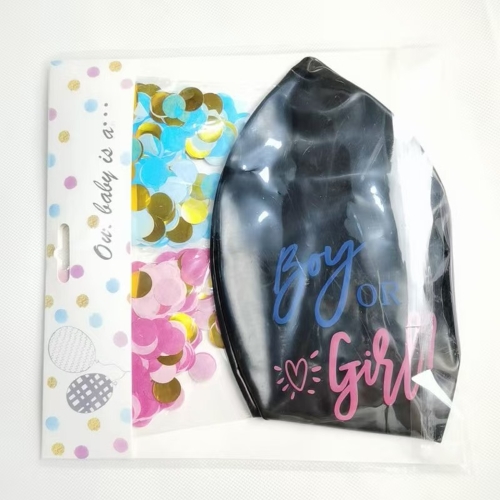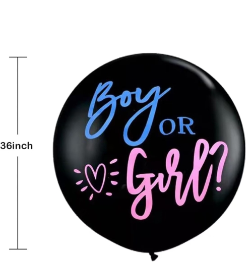 Horretarako36 hazbeteko generoa erakusteko puxikastockean, kolore beltz matea da eta estilo askotako inprimaketa du, adibidez, mutil edo neska, mutil eta neska pertsonaien argazkia edo mutil eta neskarekin lotutako beste zerbait. Konfetirako, poltsa bat paper arrosa paperezko konfeti paperezko urre koloreko konfetiarekin, beste poltsa bat paperezko paper urdineko konfeti paperezko urre koloreko konfetiarekin.