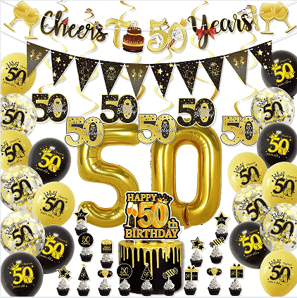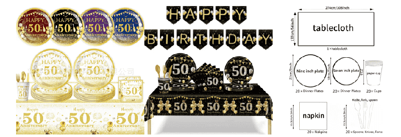 Paperezko urtebetetze apaingarria: tarta apaintzeko oinarrizko elementu gisa, txartel nagusiak "zorion urtebetetzea 50 urtera" hitzak hartzen ditu ardatz gisa, eta pastelaren dekorazio nagusia su artifizialekin, izarrekin, urtebetetze txanoarekin eta beste forma batzuekin bat egiten du. "50" biribila, hodei aproposa, koroa eta beste mini-txartel batzuk, kartoi lodiz eginak eta banbu makil sendoekin bat datozenak, cupcake eta postre mahaiekin apaindu daitezke, xehetasun bikainekin.