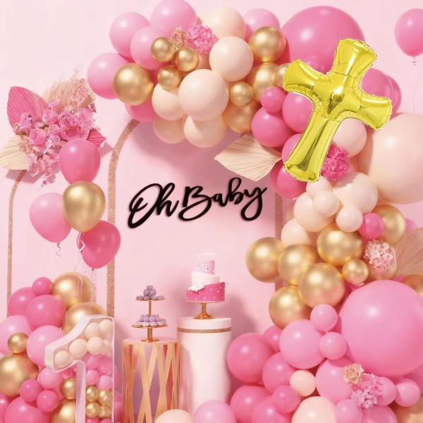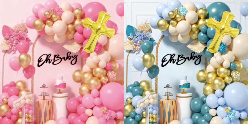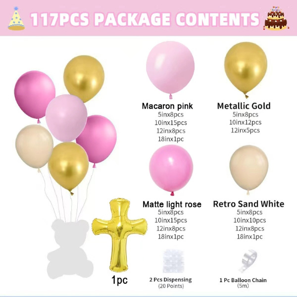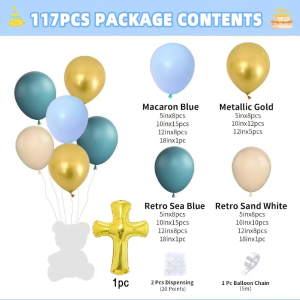 Haurtxoentzako globoen arku kitek bi estilo dituzte, estilo bat neskentzako da eta estilo bat haurtxoentzako. Neska-multzoa macaron arrosa koloreko globoz egina dago, arrosa argi koloreko globo matez, azal argi koloreko globoz matez, urre koloreko globo metalizatuz eta urrezko jainkoaren gurutze bat. Haurtxoentzako multzoa macaron kolore urdineko globoz, retro itsas urdin koloreko globoz, azal argi argizko koloreko globoz, urre koloreko globo metalizatuz eta urrezko jainkoaren gurutze batez osatuta dago. Biek kola-puntua eta puxika-bidaia dituzte, girlanda polit bat egiteko erabil ditzakezu.