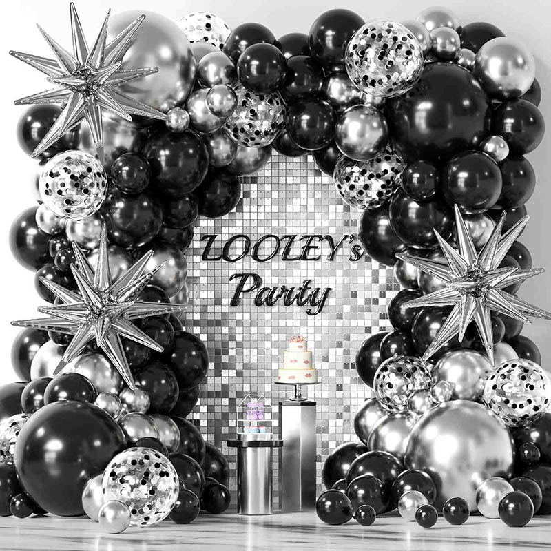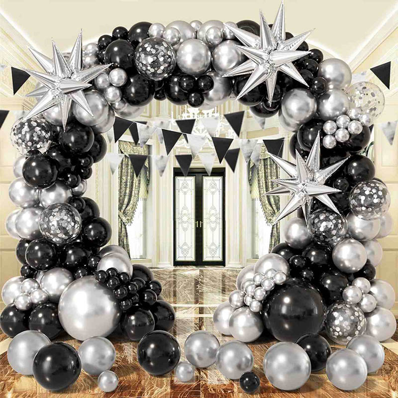Beltza eta zilarrezko festa globoen girlanden kitak oso politak dira argien azpian. Zilarrezko puxikek distira metaliko leuna ematen dute argiek jotzen dutenean. Zati beltzek ikusmen oreka egonkorra mantentzen dute. Espazioa sakonago sentiarazten dute. Argi freskoarekin edo argi beroarekin ondo doaz. Biek itxura desberdinak sortzen dituzte. Argi zuri edo urdinaren azpian, cool eta modernoak dirudite. Argi bero edo horiaren azpian, aldarte leun eta dotorea dute. Aldaketa bisual honek puxika beltz eta zilarrezko girlanda ona egiten du jaialdietarako. Oso ona da negozio-oturuntzak eta gaueko ekitaldietarako ere.