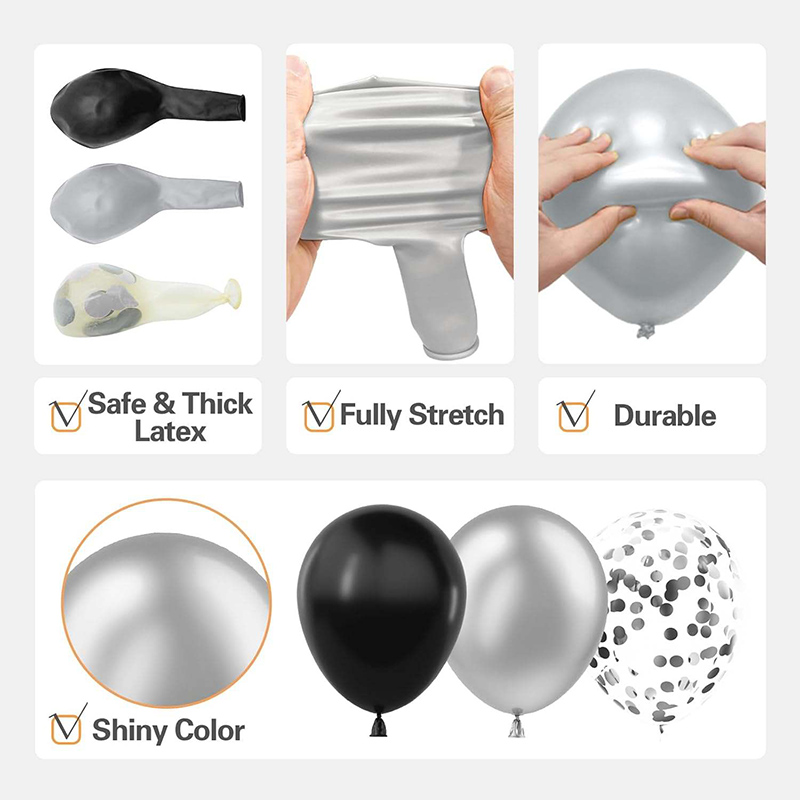 Moda Beltzez eta zilarrezko globoen girlanden kit apaingarriek maiz erabiltzen dituzte latexezko globoak. Tamaina desberdinak dituzte. Koloreak beltz matea eta zilar metalikoa dira. Geruza argiak eta bat datorren distira polita dute. Begirada osoa osoa eta hiru dimentsiokoa da. Kalitate oneko latexak puxikak luzagarriak eta leunak egiten ditu. Ez dira erraz lehertzen. Denbora luzez jarrita ere, bete-bete eta biribil geratzen dira. Ez dute airea isuriko edo kolorea erraz galduko. Multzo batzuek paperezko globoak ere badituzte. Hauek itxura islatzailea gehitzen dute. Dekorazio osoa distiratsuagoa egiten dute eta sentsazio atsegina dute. Estilo moderno dotorea erakusten dute.