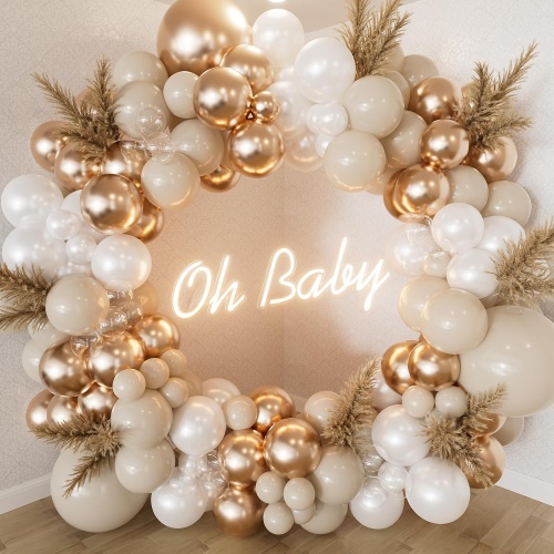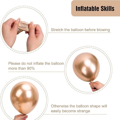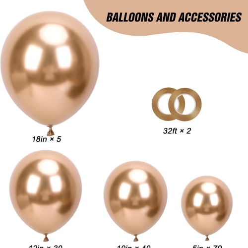 Champagne Balloon Arch-ak kalitate handiko 100-150 gutxienez biltzen ditu kantitate nahikoan moldaketa eder eta itxura osoa sortzeko. Behin muntatuta, festa giro dotore eta girotsua sortzen du. Beheko argazkian ikus dezakezu.