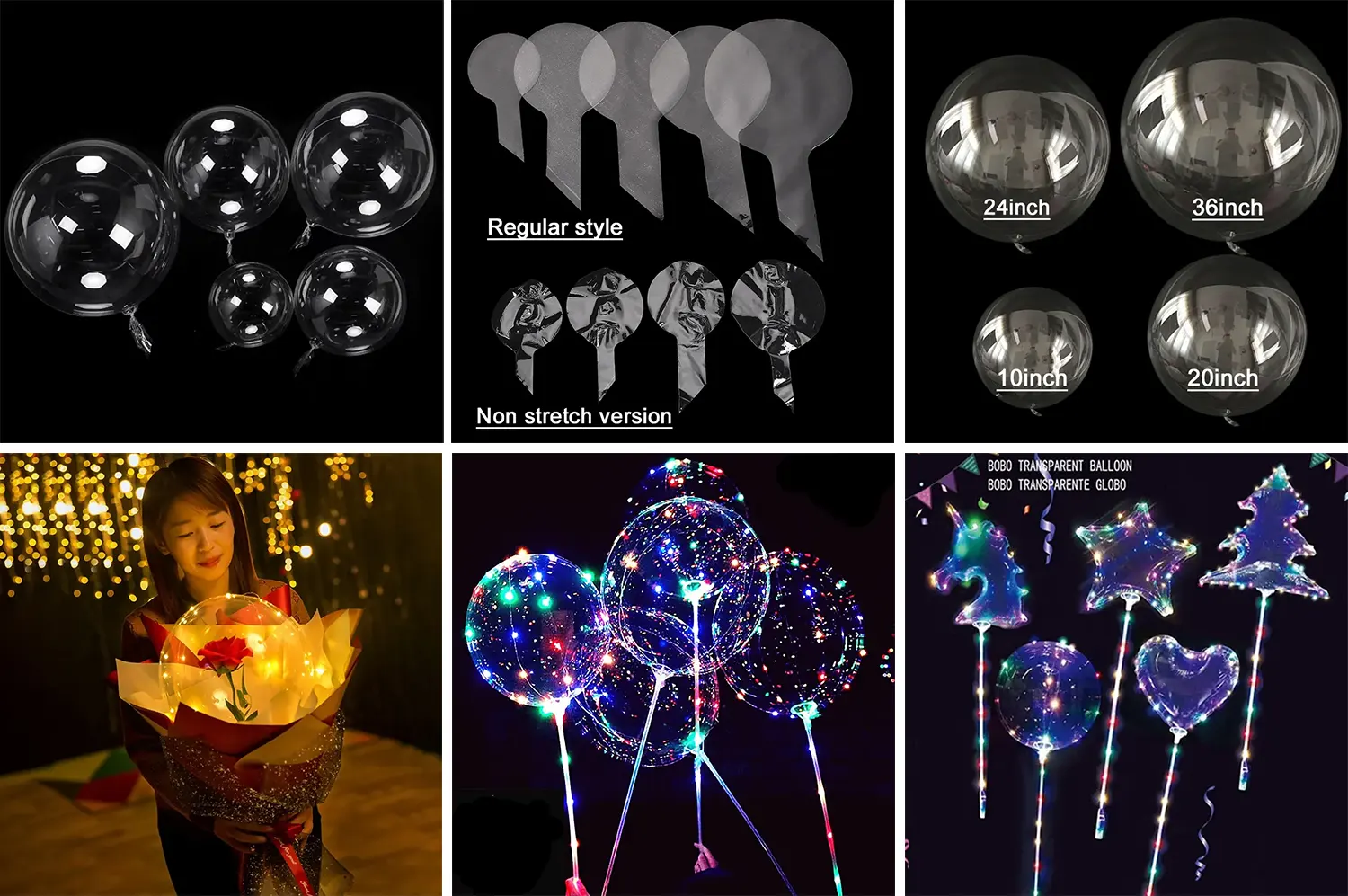 Goi mailako materialak, puruak eta gardenak: inportatutako elikagai-mailako ingurumena errespetatzen duen poliester filma hautatzen da, eta bobo globo argi bakoitzak kristal itxurako gardentasun eta distira handia du. Inflazioaren ondoren, hainbat erabilera eta efektu bisual harrigarriak ditu. .