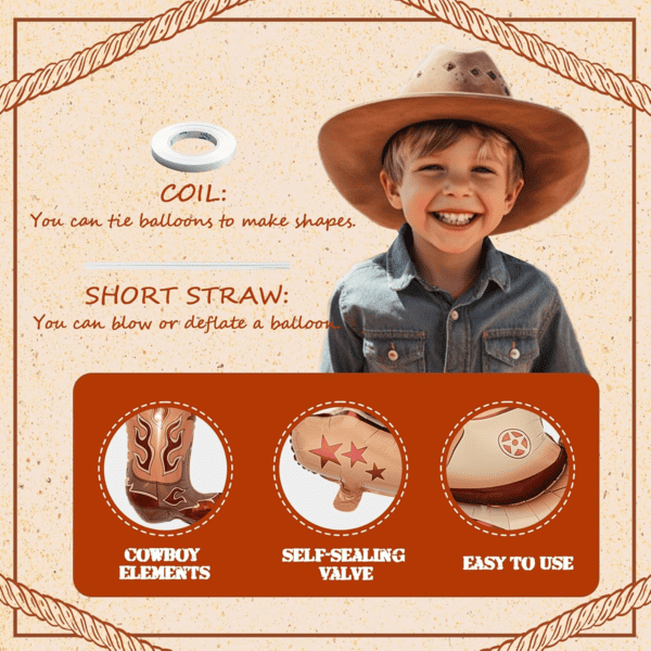 Cowboy paperezko globoak helioarekin:Bete cowboy paperezko globoak eta erlazionatutako latexezko globoak helioz, flotatutako efektua mantenduko dute. Dendan jarri edo kalean jarrita, guztion arreta erakar dezake. Zaldi paperezko globo ederrak, ertz zabaleko cowboy kapela paperezko globoak eta sugarrez pizten diren cowboy bota paperezko globoak - horiek guztiak ezinezkoak dira.