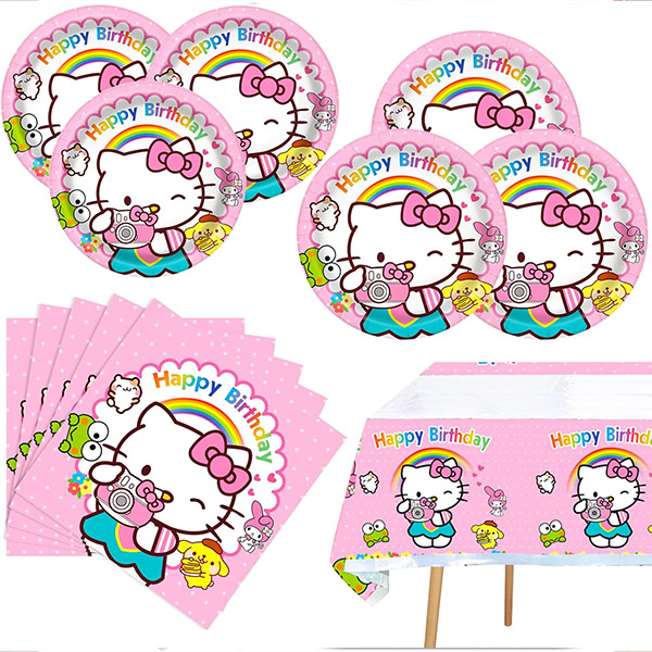 3) Mahai-tresnak: Hello Kitty-ko mahai-tresnak oraindik ere parekatu daitezke festarako arrosa eta zuriaren diseinu bereziko diseinuekin zure festarako giro polita sortzeko. Produktu guztiak oso iraunkorrak dira, kolore biziak eta kalitate handiko sentsazioa dute.