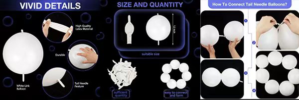 Latexazko buztanaren globo hauek oso erabiliak dira globo kateak, globoak, puxika atzeko planoak eta globo arkuak sortzeko, graduazio festak, urteurrenak eta bestelako ospakizunak gehitzen baitituzte. Moda buztanaren globoak malguak eta seguruak dira, jende gehienarentzat egokia. Gure lotura azkarreko globoak bere amaierako diseinu bakarrarekin nabarmentzen dira, tresnen beharra ezabatuz. Puxika tradizionalekin alderatuta, estekaren globoaren prozesua sinpleagoa eta azkarragoa da, zure festa edo gertaeren aretoa modu eraginkorragoan apaintzeko aukera emanez.