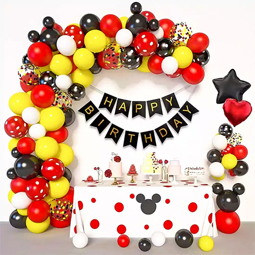 Urtebetetze-paperezko pankarta kolore biziko eta ederki moldatuta dago, eta paperezko gortina arina eta dotorea da, arku osoari giro erromantikoa gehituz. Horrez gain, Mickey Mouse puxika-arku honen diseinua berezia eta egokia da mutilen eta nesken urtebetetze festetarako, eta horrek eszenako giro bizia berehala hobetu dezake.