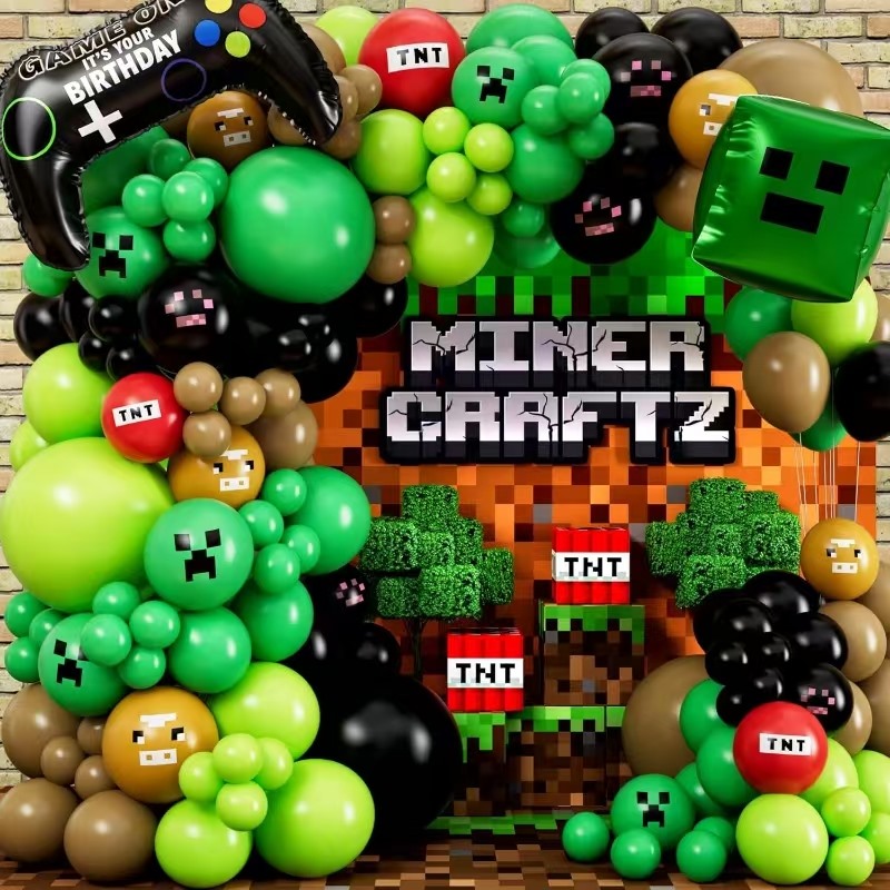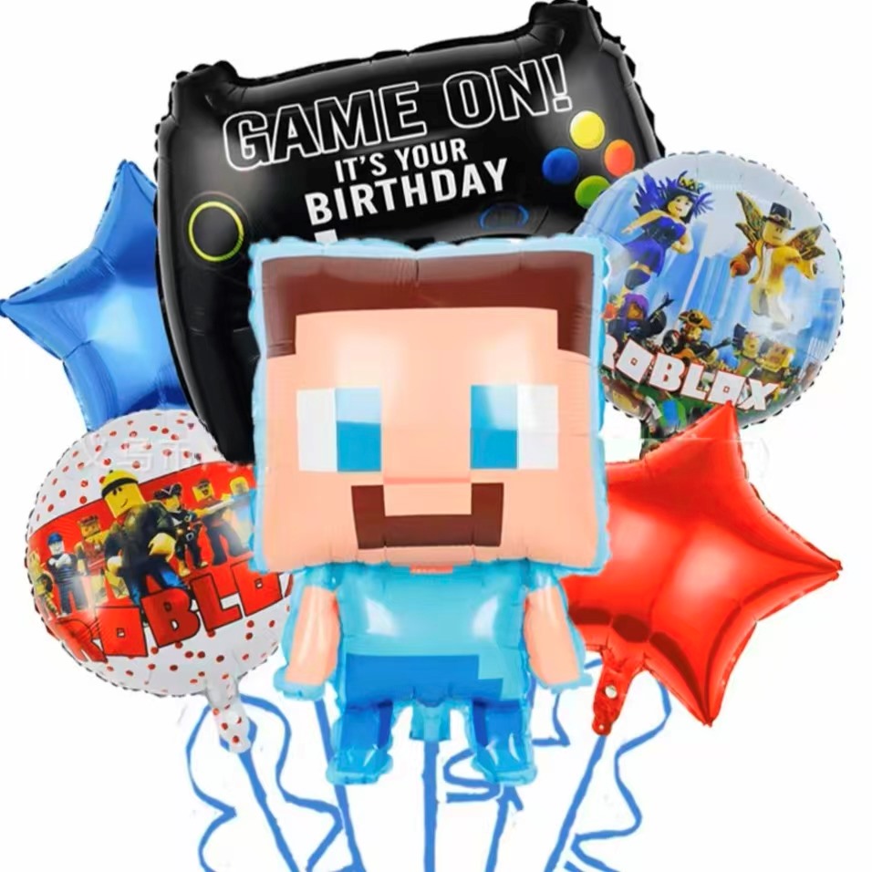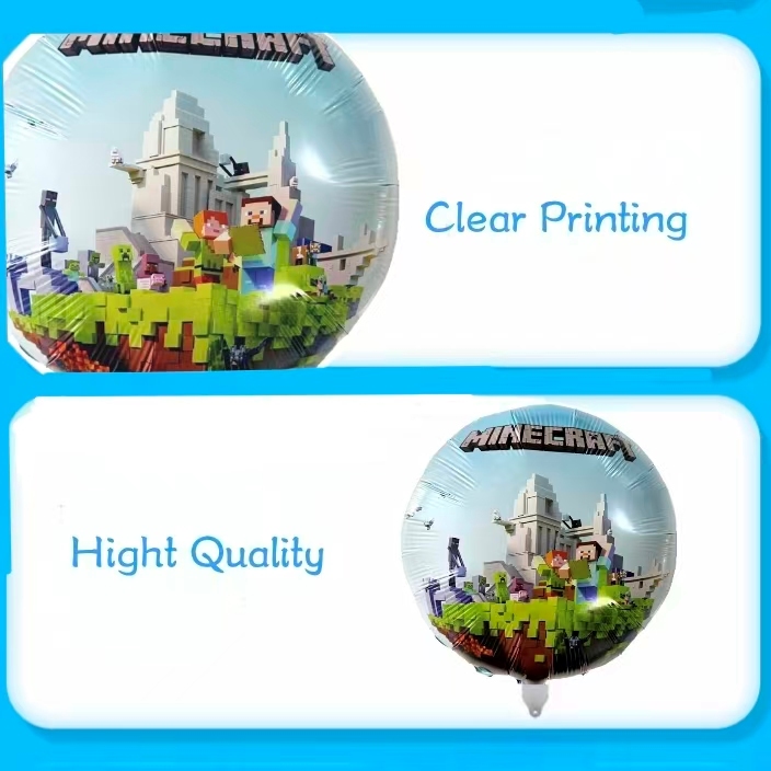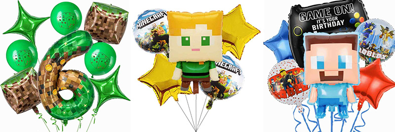 Minecraft Forma bereziko foil globoak irudimena eta joko elementuak nahasten dituzte. 3D karaktere forma asko dituzte. Pertsonaiak Steve, Creeper eta Enderman dira. Bakoitzak jokoaren xehetasunak kopiatzen ditu. Diamond Ezpatak, TNT blokeak eta joko kontroladoreak bezalako elementuak ere badaude. Festa apaingarriak dibertigarriagoak eta aberatsagoak dira. Globo bakoitzak pixeleko estiloa erabiltzen du. Creeper-ek bloke berdea du. Steve-k kamiseta urdina du. Xehetasunak blokearen mundua benetako festan bezala sentitzen da.