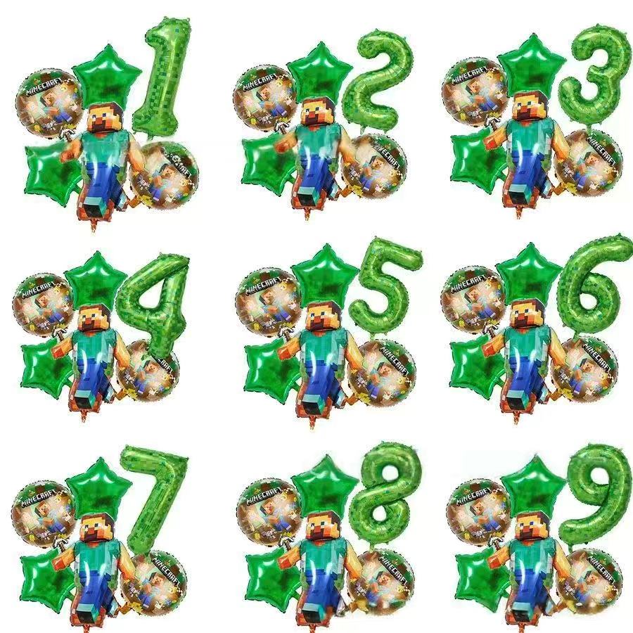 Minecraft Number Foil globoak jokoan belarra eta zikinkeria geruzen pixeleko patroietan inspiratuta daude. Zenbaki berdeko formetan sartzen dira, 1etik 9ra estalita. Zenbakien inguruko pixeleko ehundura joko estiloa kopiatzen du. Bikote belar blokeekin eta izar globoekin. Adinaren pantailak Minecraft itxura ere badu. Urtebetetze festetarako nabarmentzekoak dira.