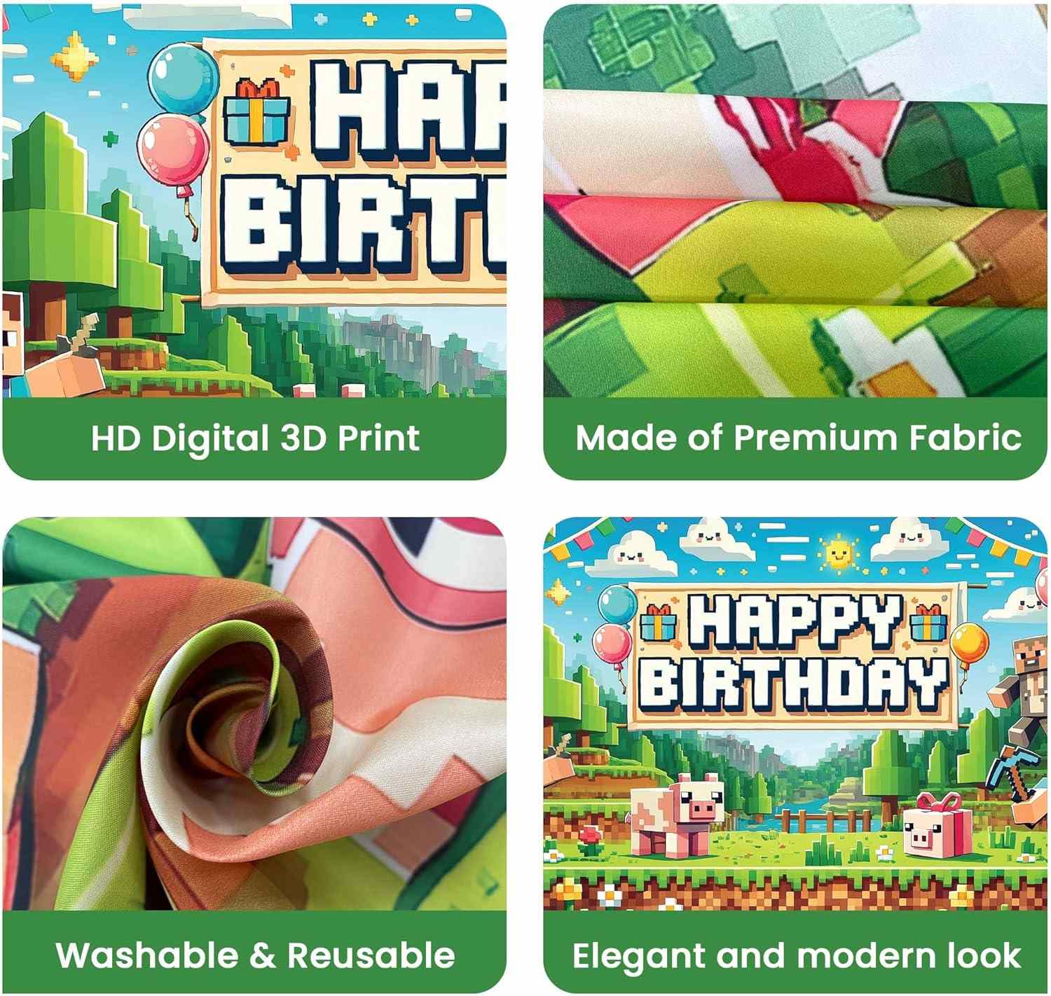Elementuak gaiaren arabera bat egin daitezke. Minecraft mahaiaren estiloko mahai berberekin joan daiteke. Minecraft mahaiaren estilo bereko atzeko planoarekin joan daiteke. Minecraft mahai-zapia estilo bandera berarekin joan daiteke. Multzoak latexeko globo berdeak gehitu ditzake. Multzoak latex marroi globoak gehitu ditzake. Multzoak pixeleko paperezko globoak gehitu ditzake. Festak bloke mundu itxura du.