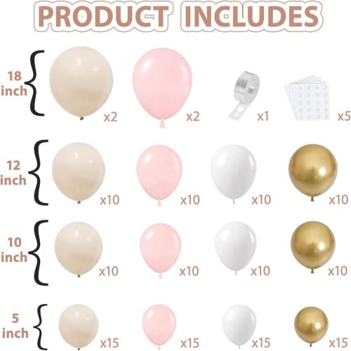 Globo-arku zuri arrosa beige kolore argi batzuekin datorlatexezko puxika, eta kromozko urrezko globoak apaingarri gisa. Hainbat geruza egiteko, eman ditugun globoek ere hainbat tamaina dituzte, hala nola 5 hazbeteko, 10 hazbeteko, 12 hazbeteko eta 18 hazbeteko. Guztira 144 pieza da. Globo arrosak barne: 37 pz, puxika zuriak: 37 pieza, globo zuri mateak: 35 pz, urre koloreko globoak: 35 pz, puxika-zinta 1 roll, 5 globo eranskailuak. Paketean sartzen diren konbinazio finkoez gain, zuretzako ere pertsonaliza dezakegu. Globoen kantitatea, tamaina edo kolorea izan, denak alda daitezke zure arabera. Puxikak eta osagarriak erabiliz, globo zuri arrosa beige, globo zuri arrosa txikia eta beste konbinazio batzuk ere egin ditzakezu. Horiek guztiak izango dira giro oneko sortzaileak.