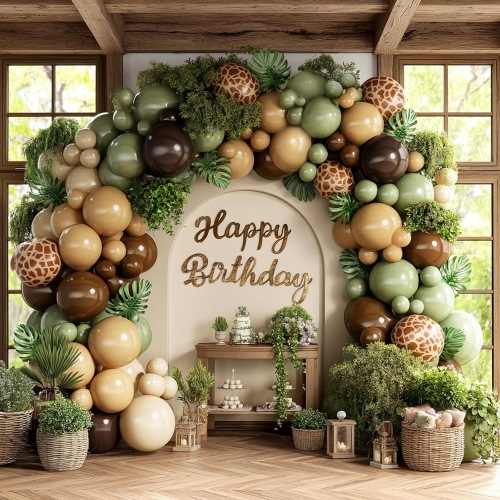 Safari Balloon Arch-ek basoko gai baten oinarrizko elementuak ditu. Puxik marroiek zuhaitz enborrak irudikatzen dituzte, puxik berdeek hostoak sinbolizatzen dituzte eta inprimatutako puxikak hainbat animalia irudikatzen dituzte, basoan bertan festa bat antolatzearen sentsazioa sortuz. Esfortzurik gabe festa-eszena dotorea eta atmosferikoa sortzen du.