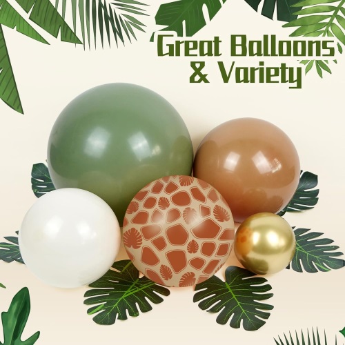 Safari globo-arku bakoitzeko latexezko 100 globo baino gehiago daude. 5 hazbeteko, 10 hazbeteko eta 18 hazbeteko latexezko globoak, 5 hazbeteko, 10 hazbeteko eta 18 hazbeteko ahuakate berde latexeko globoak, 5 hazbeteko, 10 hazbeteko eta 18 hazbeteko latexezko globoak marroiak, 10 hazbeteko harea zuriko latexezko globoak, 10 hazbeteko, 10 hazbeteko puxika berdeak eta 10 hazbeteko globoak. kromozko urrezko latexezko globoak, 12 hazbeteko konfeti latexezko globoak, 12 hazbeteko jirafa inprimatzeko globoak, 12 hazbeteko tigrea inprimatzeko globoak eta globo osagarriak.