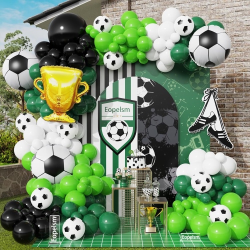 Kitek 12 hazbeteko berde iluna dutelatexezko puxikak, 12 hazbeteko latexezko globoak, 12 hazbeteko konfeti berdea latexezko globoak, 12 hazbeteko metalezko zilarrezko latexezko globoak, 12 hazbeteko futbola inprimatzeko latexezko globoak, futboleko paperezko globoak, izar globoak, Happy Birthday paperezko pankarta, paperezko loreak eta osagarriak, hala nola kola-puntua, zinta eta puxikak.