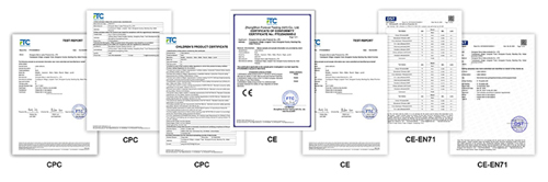 Gure produktu-sorta osoak CPC, CE, EN71 eta beste aginpidezko ziurtagiriak gainditu ditu, Europako eta Amerikako eta xede-merkatuko segurtasun-araudiak zorrotz betez. Kualifikazio hauek zure salgaiak aduanak ondo garbitzen lagun diezaiekete eta atzerriko merkatuetan betetzeko arriskuak guztiz saihesten.