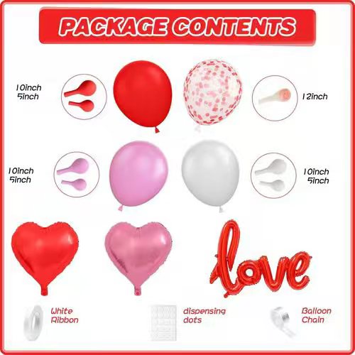 San Valentin eguneko globoen arku kit gure jaialdiko globoen kitetako bat da. San Valentin eguna, normalean, otsailaren 14an izaten da urtero. Maitasunez eta amodioz, jaialdi hau oso ezaguna da mundu osoan. Beraz, globoen kit hau gure saldu onena da. Ez du axola ospakizunetarako, ezkontzarako edo festarako. Aukera ona izango da.
