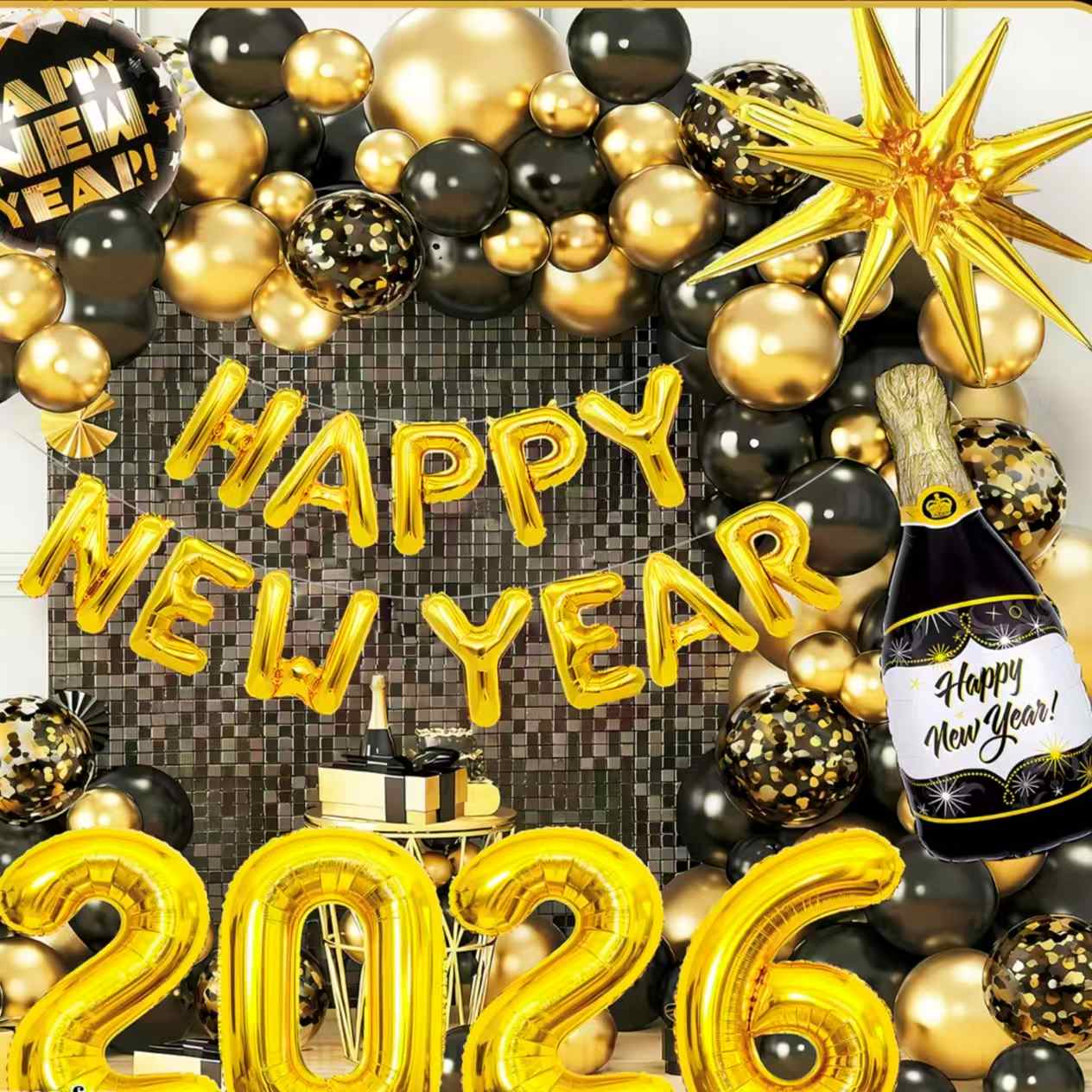 Pentsa Urte Berriaren gaiari buruz. Txanpain botila itxura duten paperezko globoak ditu. "2026" zenbaki-puxikak, izar apaingarriak eta abar ere biltzen ditu. Kolore nagusiak beltza-urrea edo urre-zuria dira. Urteberriko jai alaitasunez beteta dago. Erraz egin dezake Urte Berriko festa eszena luxuzko eta zeremonial bat.
